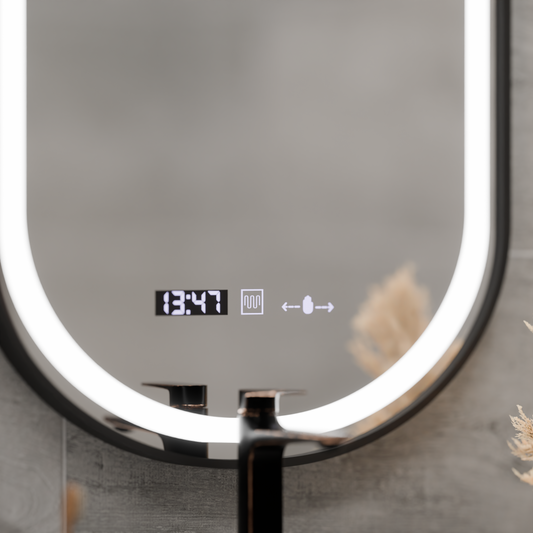 Super cena Wyprzedaż zimowaLustro LED Touch System odmgławiania NOVARA, zegar i temperatura 50 cm Czarna szczotkowana rama