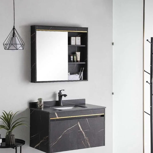 Zestaw szafek łazienkowych z lustrem LED i podwieszaną szafką pod umywalkę, 60x70 cm, czarno-biały, nowoczesny, minimalistyczny design