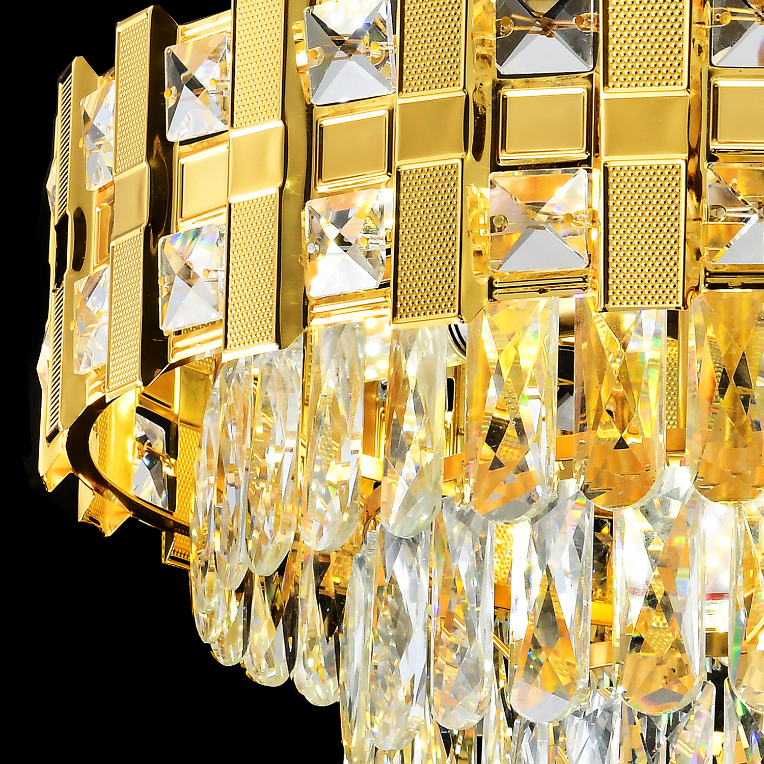 Połączenie lśniącego, złotego wykończenia i starannie fasetowanych kryształów tworzy efekt świetlny i refleksy, podkreślając wyrafinowanie każdego detalu. Regulowana wysokość dodaje uniwersalności i pozwala na harmonijną integrację z różnymi aranżacjami.
