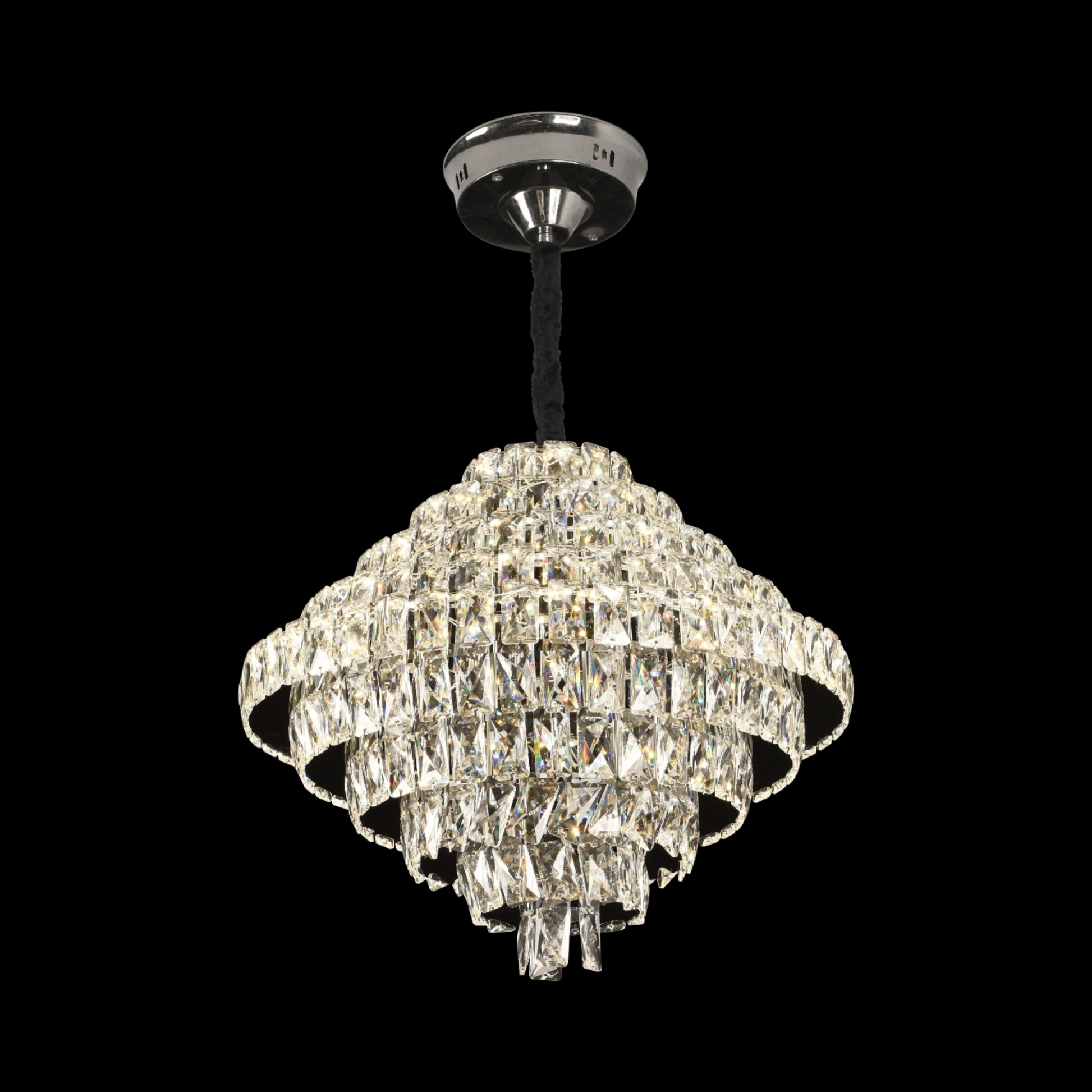 Z jednym średnica 50 cm i regulowana wysokość, harmonijnie integruje się ze średnimi i dużymi przestrzeniami, stając się wyrafinowanym elementem centralnym. Kryształy w efektowny sposób odbijają światło, dodając wnętrzu blasku i elegancji.