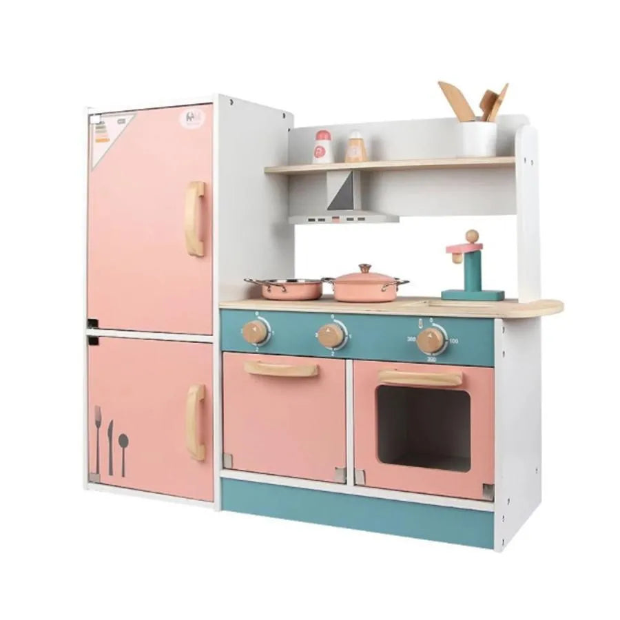 Kompletna zabawka kuchenna z różnymi akcesoriami i lodówką, 45 elementów, turkusowy z różowym, drewno