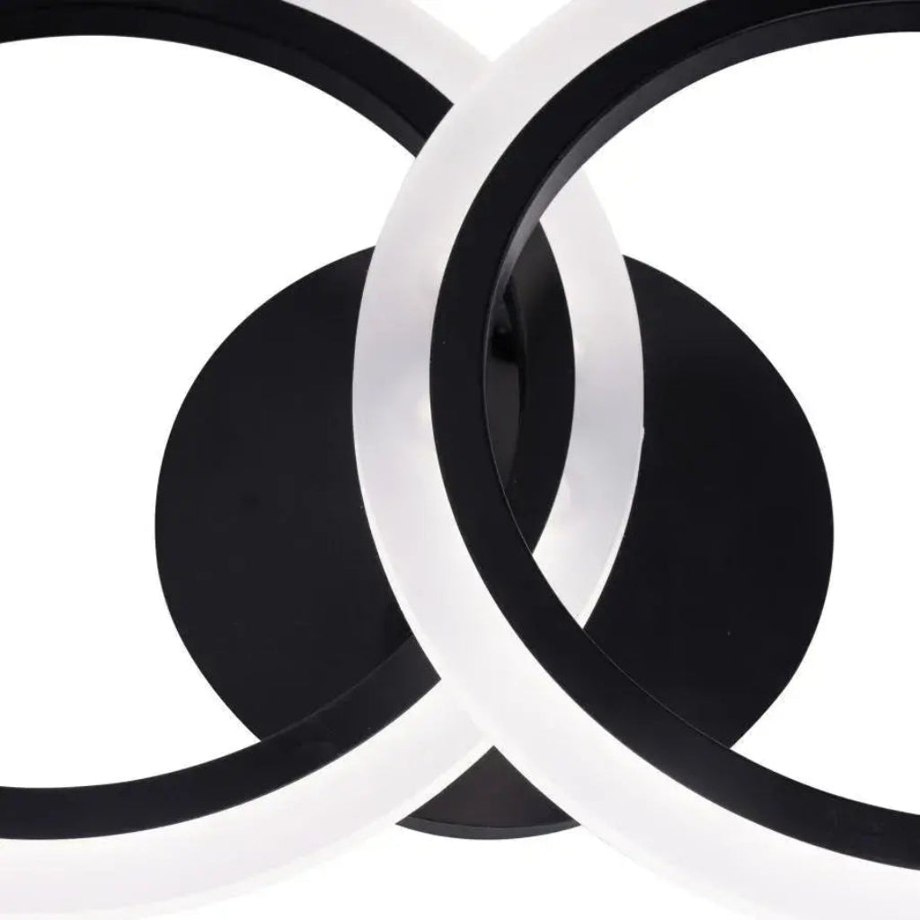 Dwa czarne okręgi , być może o różnych rozmiarach lub ułożone w sposób tworzący ciekawy efekt wizualny, są podświetlane diodami LED z możliwością wyboru temperatury barwowej. Za pomocą pilota można wybierać między zimnym światłem (dla energetyzującej atmosfery), ciepłym (dla przytulnej i relaksującej atmosfery) lub neutralnym (do oświetlenia ogólnego). Funkcja ściemniania pozwala idealnie dopasować natężenie światła do każdej sytuacji.