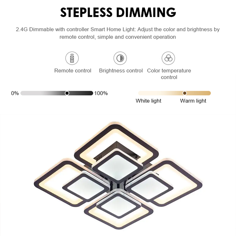 LED żyrandol z zdalnym sterowaniem sezamem 77W, 4 kwadraty, zimno/gorące/neutralne światło, niestabilne, czarne