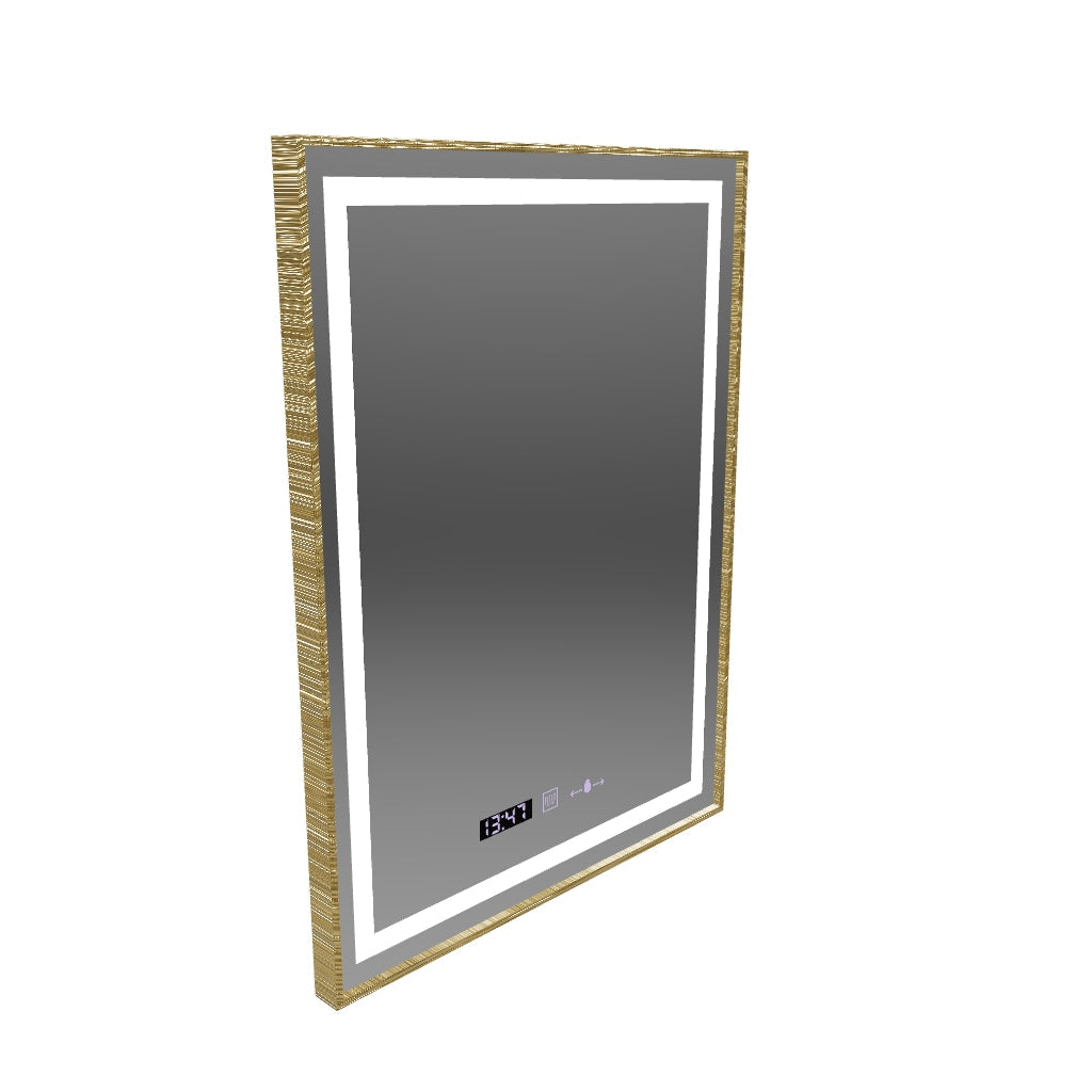 Prostokątne lustro LED, 60x80 cm, Verite Royale Gold MotionGlow Marcello, system przeciwmgielny, zegar i termometr, ściemnialne