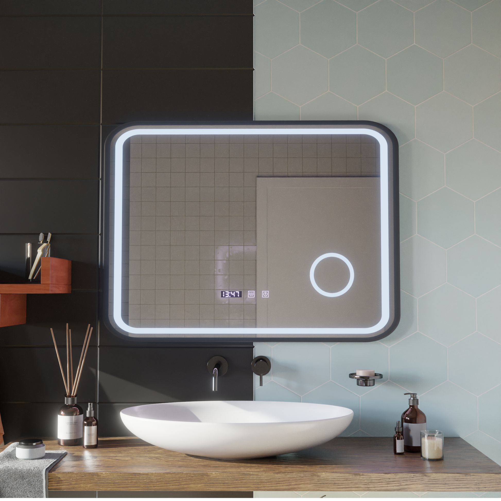 Bernd Touch LED Mirror Defog System, zegar i temperatura 80x60 cm szczotkowana czarna rama lupa kosmetyczna