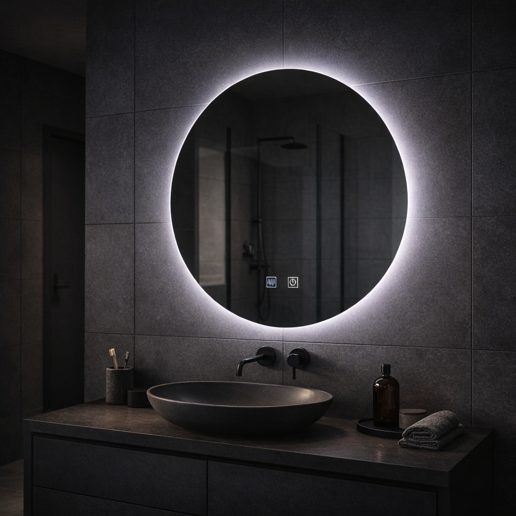 Okrągłe lusterko LED, 60 cm, Celeste Majesté noir Motionglow Marcello, system rozmrażania, zegar i termometr, Dokryty