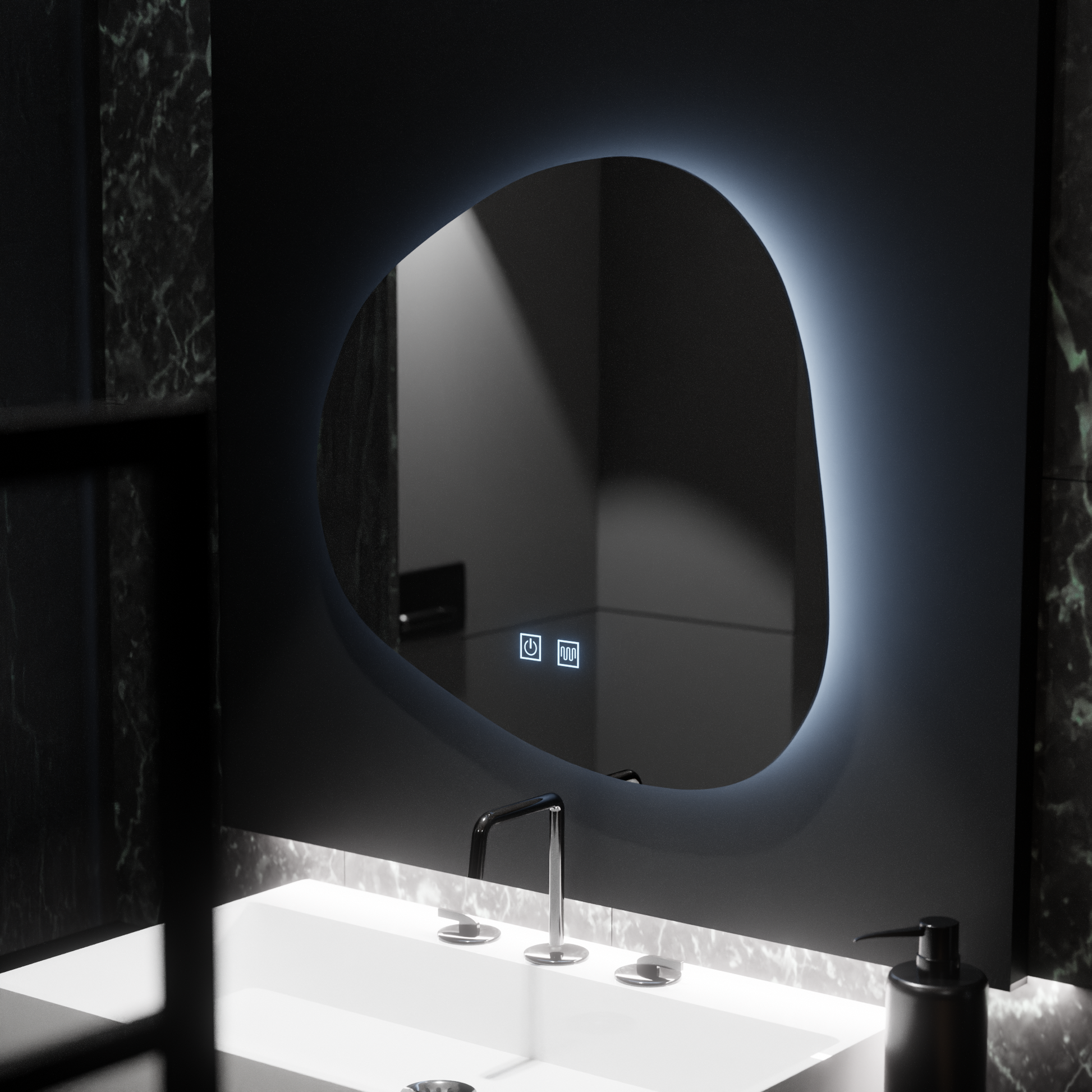 Organiczne lustro LED Duna Touch, o wymiarach około 60 x 60 cm (kształt organiczny może się nieznacznie różnić od idealnego kwadratu), przynosi płynną i naturalną konstrukcję w Twojej przestrzeni. W przeciwieństwie do tradycyjnych prostokątnych lub okrągłych form, jego nieregularny i harmonijny kontur dodaje dodatkową oryginalność i finezję.