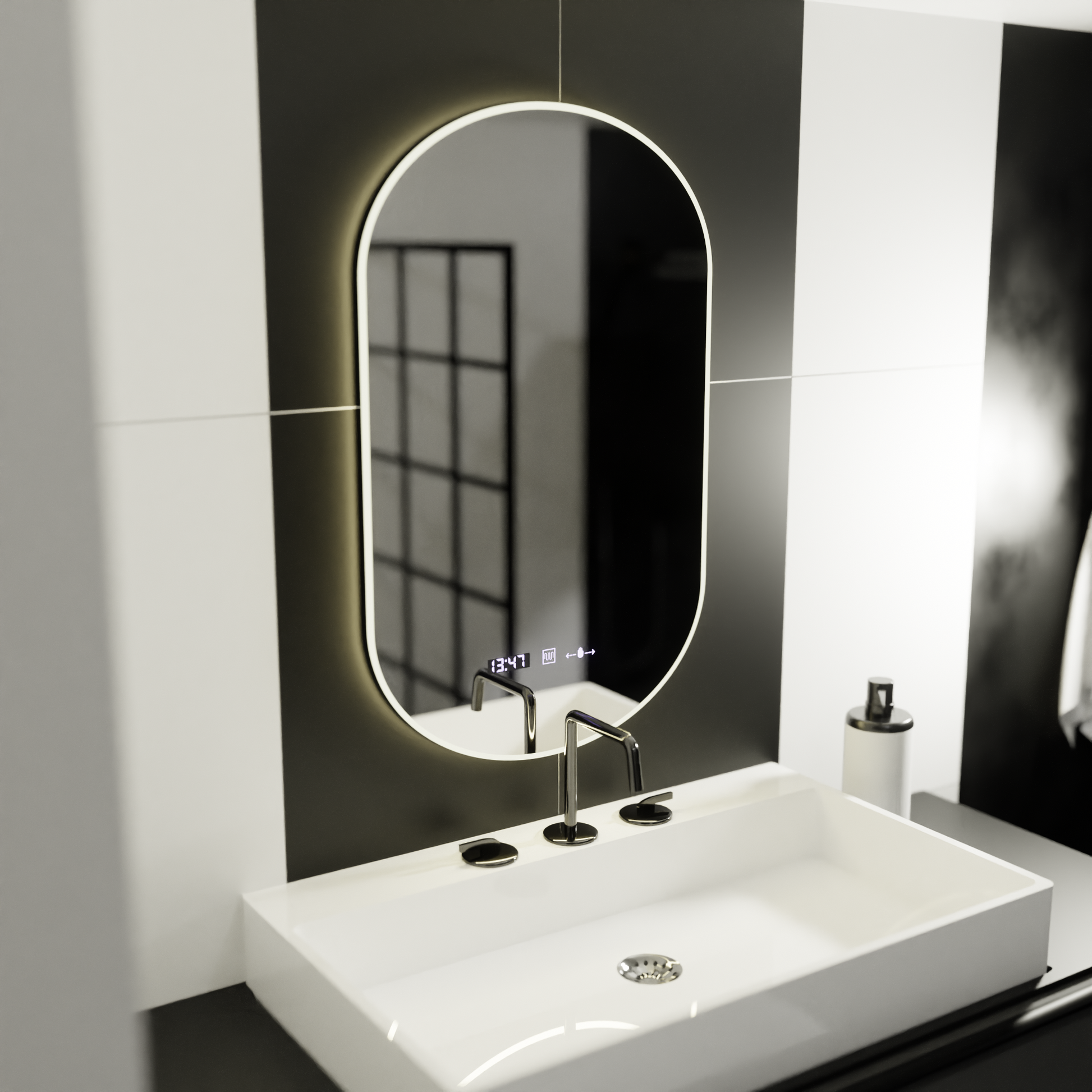 Owalne LED lustro 50x80 cm Lucia - Marcello Wyraża wrażenie płynnymi liniami i dyskretnie zintegrowaną technologią. Wyposażony w czujnik aktywacji, cierędne oświetlenie LED i inteligentne funkcje, takie jak niepełnosprawność, termometr zegarowy i cyfrowy, Lucia jest idealnym wyborem dla nowoczesnej, funkcjonalnej i wyrafinowanej przestrzeni.