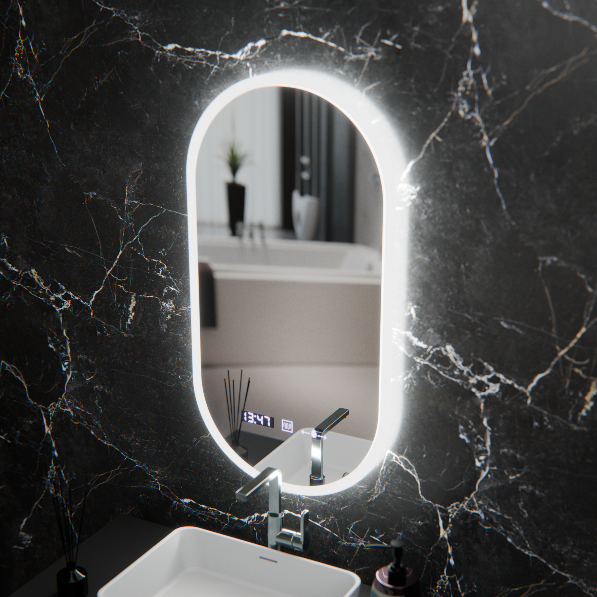 Owalne LED lusterka, 50 x 100 cm, czujnik Lucia Marcello, system rozmrażania, zegar i termometr, Dokryty