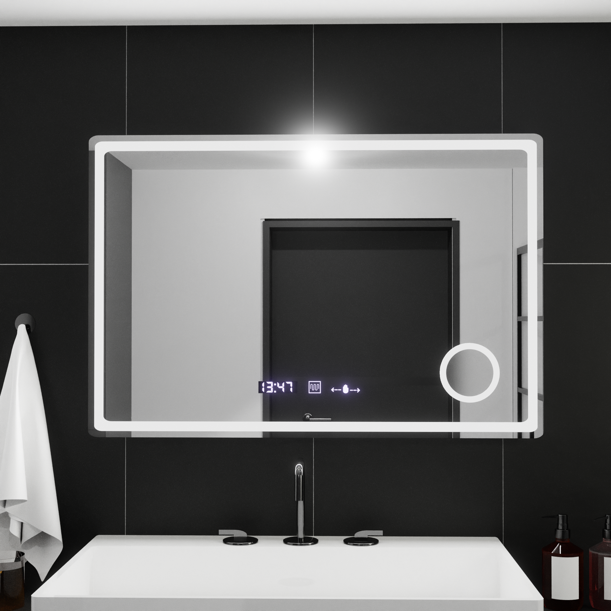 Prostokątne lustro LED, 60x80 cm, Eclat MotionGlow Marcello, zegar i termometr, system przeciwmgielny, lupa kosmetyczna, ściemnialna