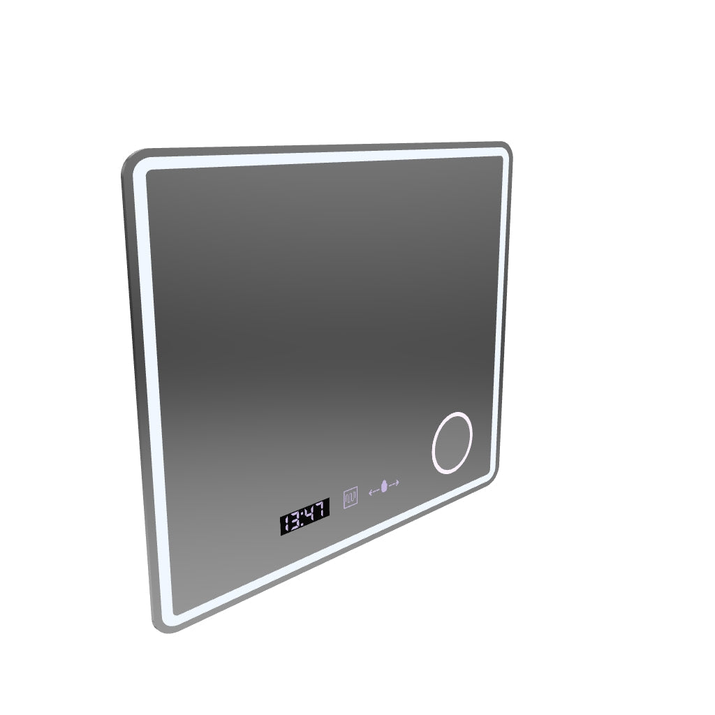 Prostokątne lustro LED, 60x80 cm, Eclat MotionGlow Marcello, zegar i termometr, system przeciwmgielny, lupa kosmetyczna, ściemnialna