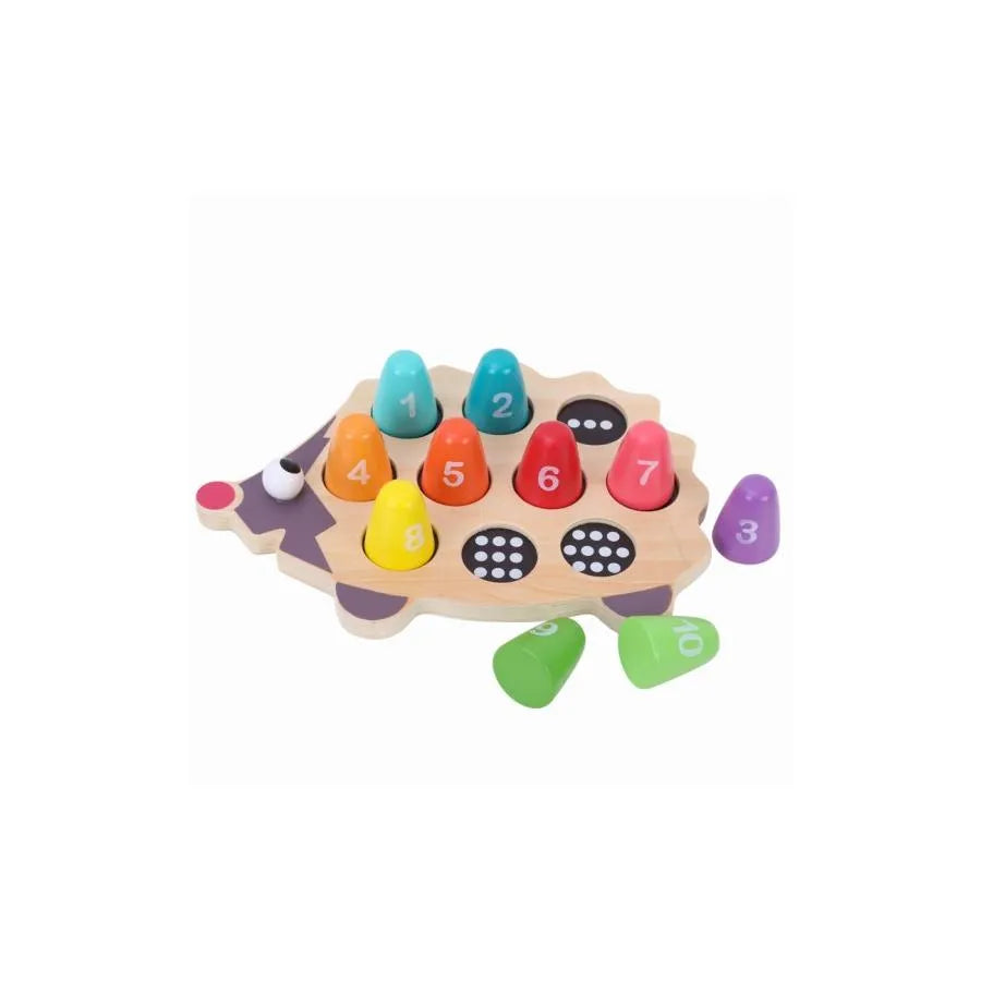 Drewniana gra skojarzeniowa „Jeż” jest edukacyjną zabawką Montessori, która pomaga dzieciom uczyć się i kojarzyć liczby z odpowiadającymi im symbolami graficznymi.