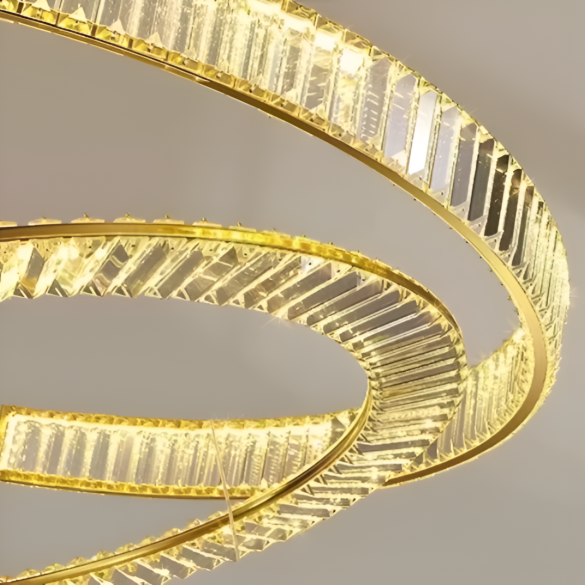 Dwa okręgi są bogato zdobione wysokiej jakości przezroczystymi kryształami, które odbijają i załamują światło zintegrowanej diody LED, tworząc spektakularny efekt wizualny i luksusową atmosferę. Dołączony pilot zdalnego sterowania zapewnia pełną kontrolę nad oświetleniem: możesz wybierać między światłem zimnym (dla uzyskania żywej atmosfery), ciepłym (dla przytulnej i relaksującej atmosfery) lub neutralnym (dla oświetlenia ogólnego), a funkcją ściemniania możesz regulować natężenie światła, idealnie dostosowując je do każdej okazji.
