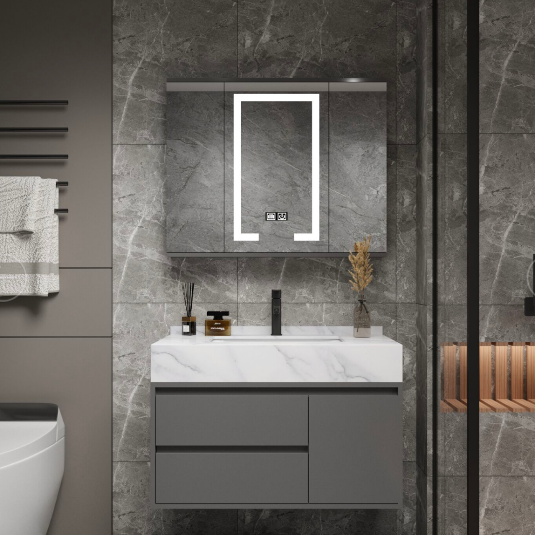Górna część korpusu (meble z lustrem LED): Jest to szafka wisząca z lustrem z przodu. System oświetlenia LED jest zintegrowany z konturem lustra i emituje światło na zewnątrz, tworząc ogólną atmosferę łazienki. Za lustrem znajduje się miejsce do przechowywania kosmetyków i artykułów higienicznych.