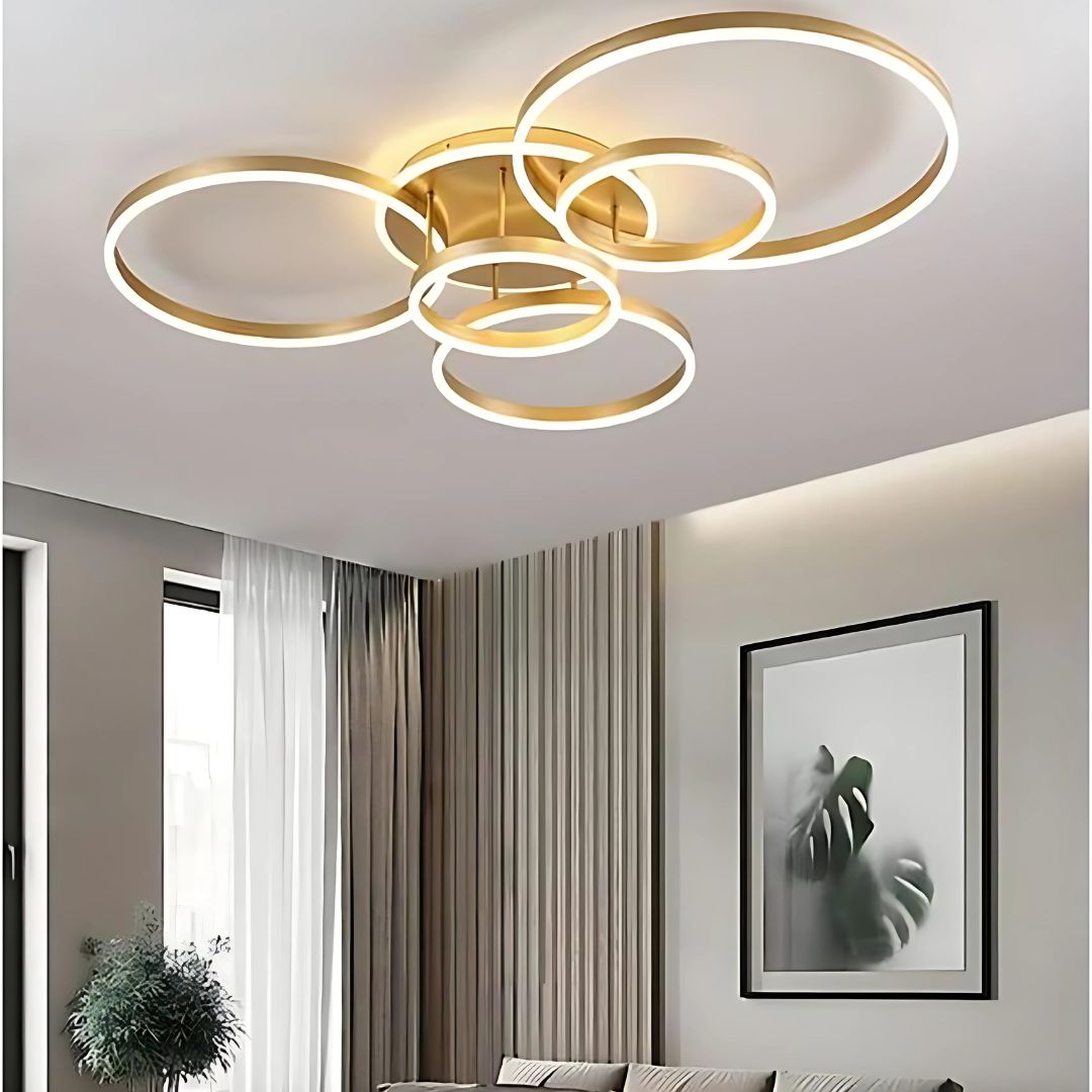Żyrandol LED z pilotem DARIO, 5 kółek, 138W, światło ciepłe/zimne/neutralne, możliwość przyciemniania, złoty