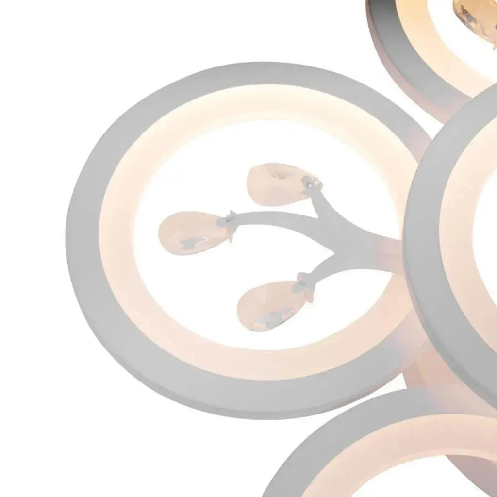 Sześć białych elementów, których specyficzny kształt definiuje styl (mogą to być stylizowane ramiona, geometryczne kształty itp.), wzbogacono kryształami, które odbijają i załamują zintegrowane światło LED, tworząc olśniewający efekt i wyrafinowaną atmosferę. Dołączony pilot zdalnego sterowania umożliwia sterowanie temperaturą barwową (zimna, ciepła lub neutralna) oraz intensywnością światła (ściemnianie), co pozwala dostosować oświetlenie do aktualnych potrzeb.