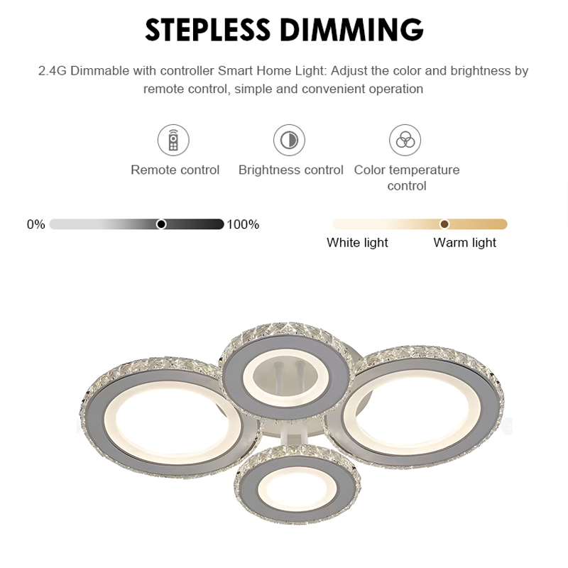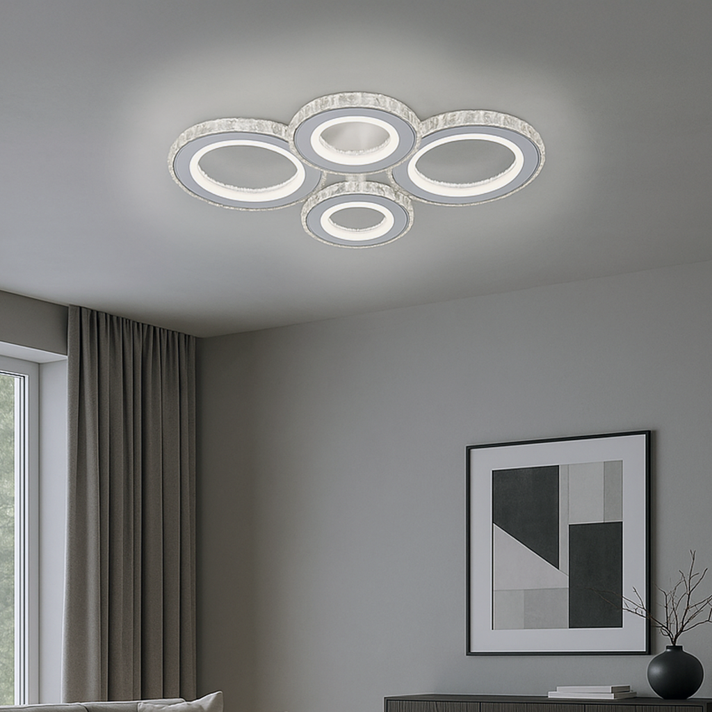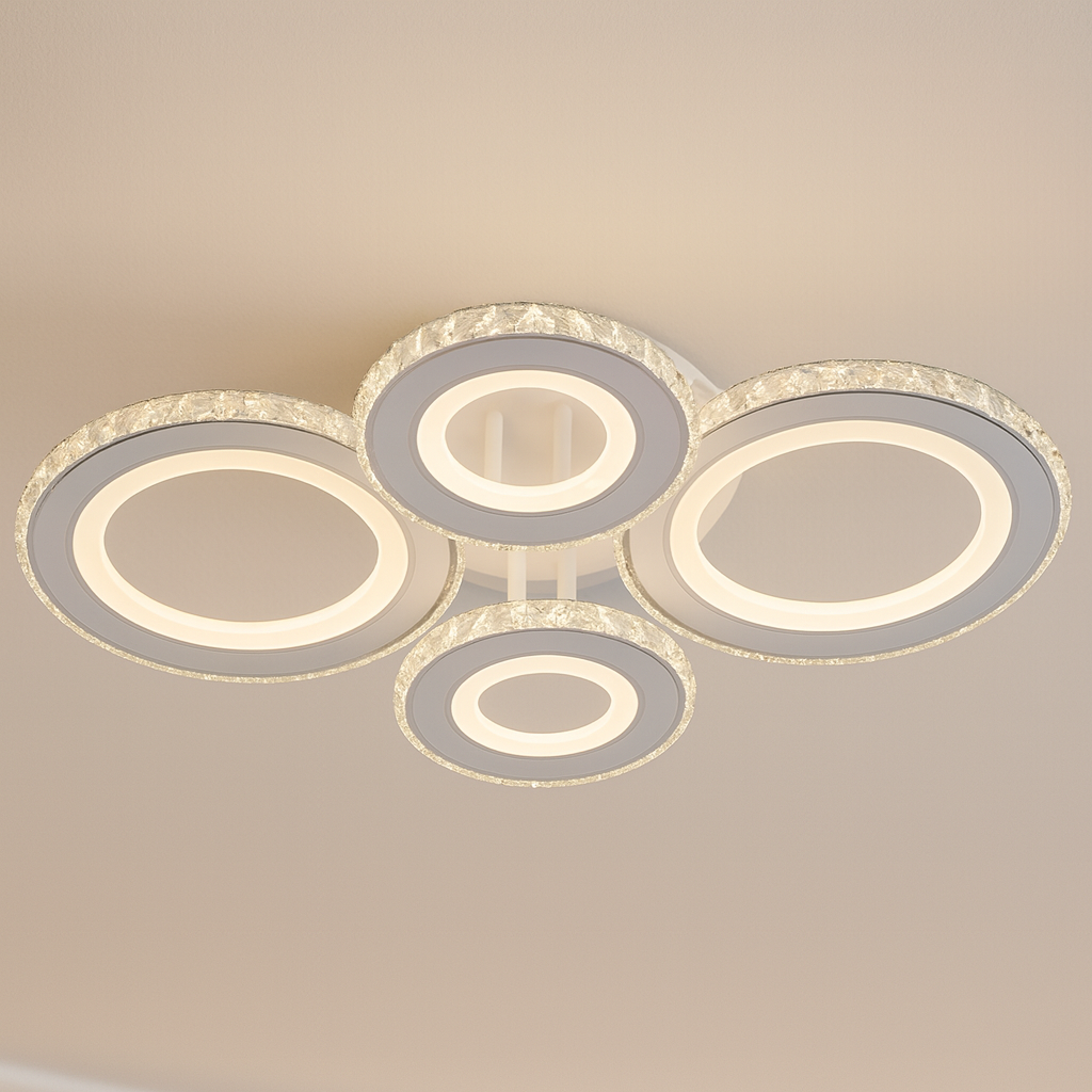 Żyrandol LED z pilotem i kryształem NOVA ROTONDA RGB 86W, 4 okręgi, światło zimne/ciepłe/neutralne, ściemnialny, biały