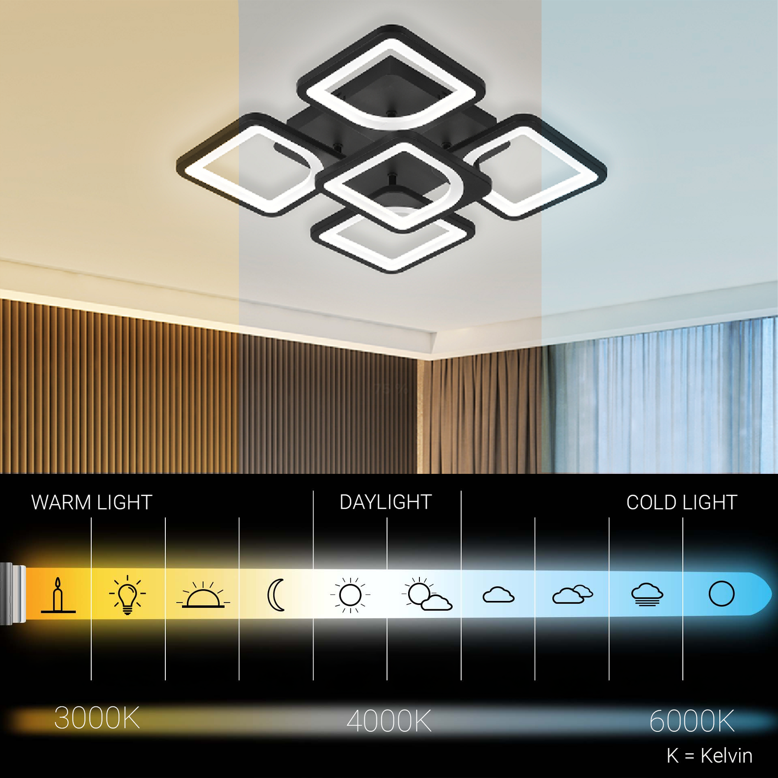 Pięć kwadratów, ułożonych prawdopodobnie w sposób tworzący ciekawą całość wizualną, oświetlonych jest diodami LED z możliwością wyboru temperatury barwowej. Za pomocą pilota możesz wybrać pomiędzy światłem zimnym (dla energetyzującej atmosfery), ciepłym (dla przyjaznej i relaksującej atmosfery) lub neutralnym (dla oświetlenia ogólnego). Funkcja ściemniania pozwala dostosować intensywność światła tak, aby idealnie pasowała do każdej chwili.