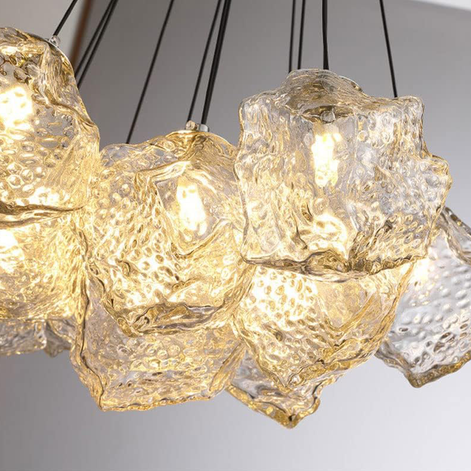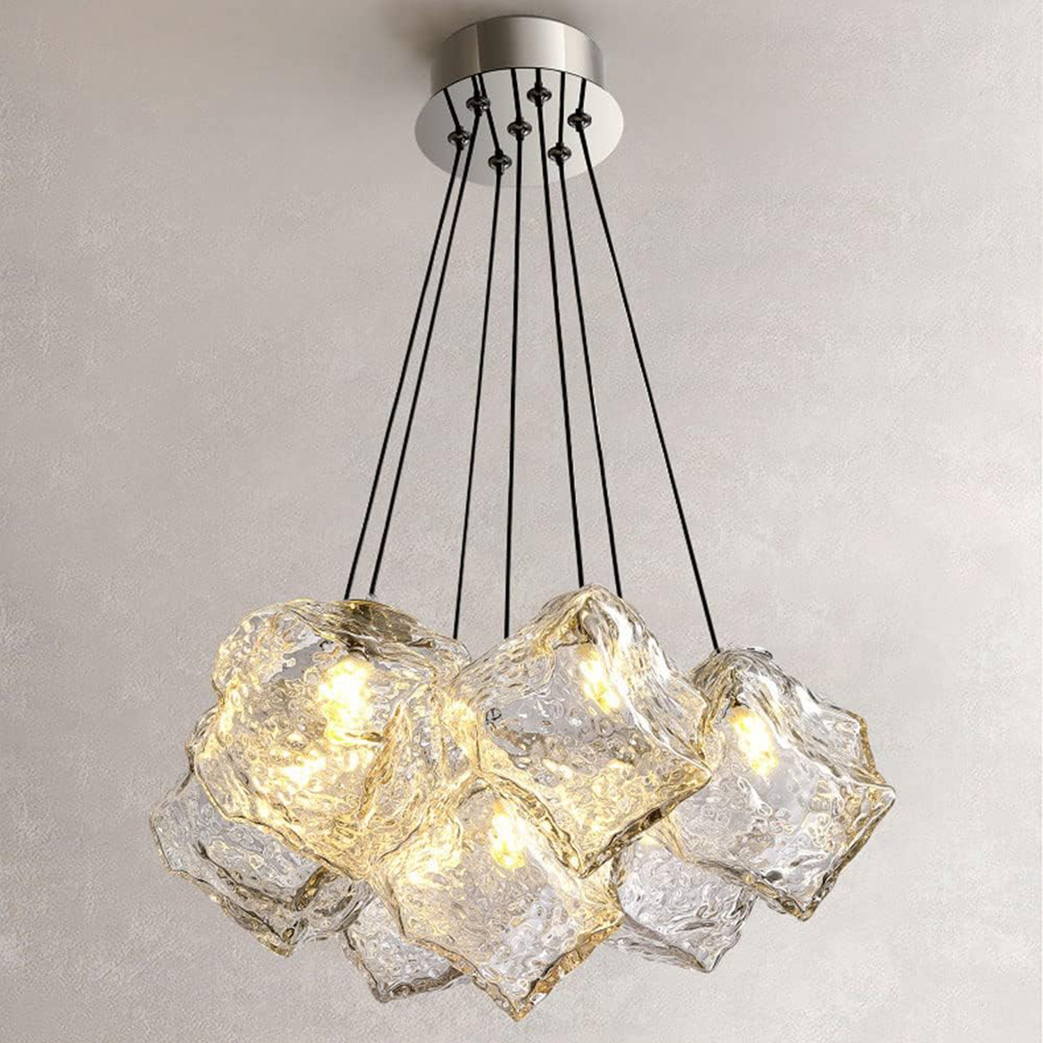 Ten wiszący żyrandol ECOLUCE o spektakularnym designie i lśniącym chromowanym wykończeniu składa się z 7 źródeł światła, harmonijnie rozmieszczonych w kształcie kuli. Nieregularnie teksturowane szklane elementy tworzą ciekawą grę odbić, stanowiąc wizualne urozmaicenie dużych pomieszczeń, takich jak salon czy jadalnia.