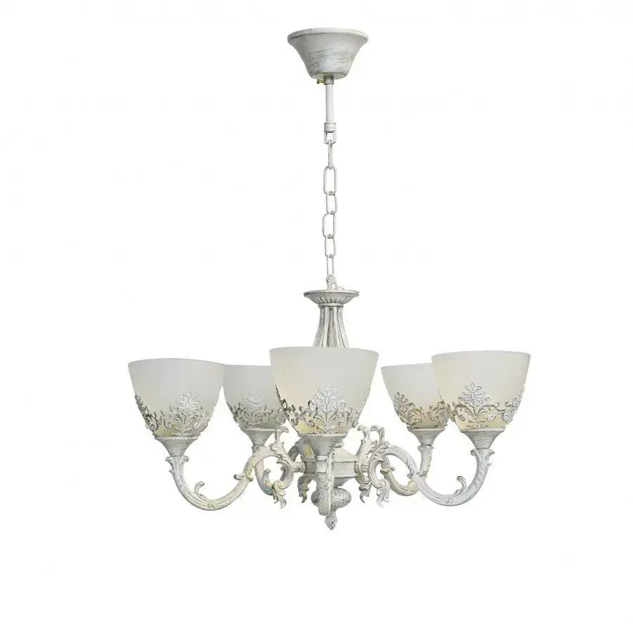 Ten barokowy żyrandol z wytłoczonymi motywami kwiatowymi to klasyczny wybór do eleganckich wnętrz. Dzięki białej, patynowanej metalowej konstrukcji i dekoracyjnym kloszom z matowego szkła , oferuje ciepły i wyrafinowany efekt wizualny. Każde ramię wyposażone jest w gniazdo E27 , umożliwiające montaż 5 żarówek, które można wybrać w zależności od preferencji – LED, energooszczędnych lub żarowych.